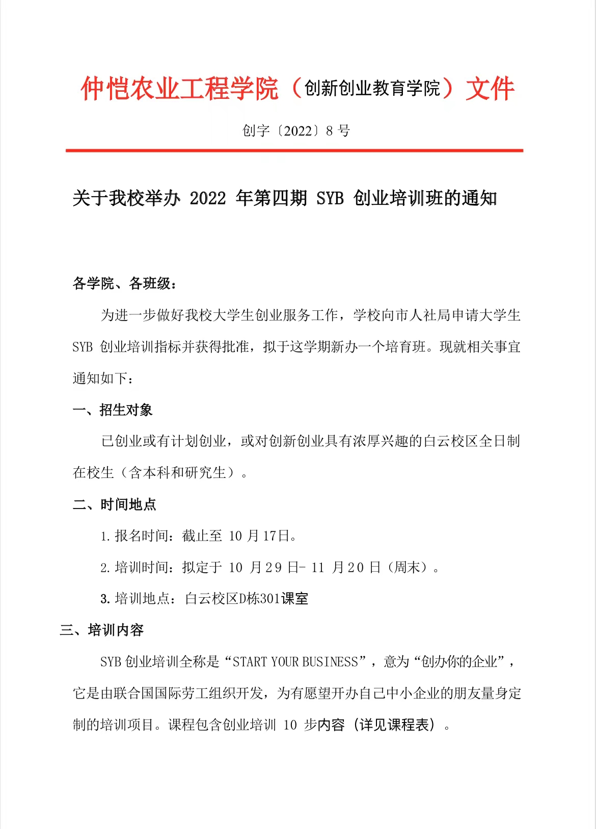 关于公司举办2022年第四期SYB创业培训班的通知