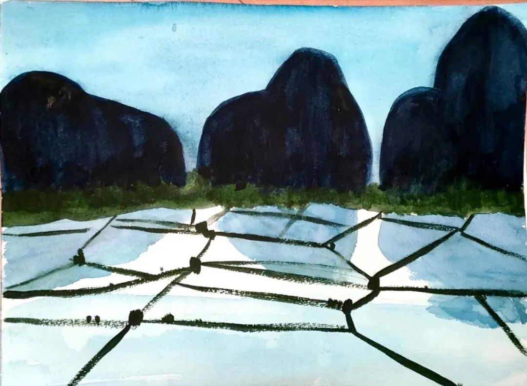 创作思路:以地平线分界,往上看是一座座的远山,往下看是一片片的稻田,中间是山脚下一排排的树木。天空是蓝色的;地平线是紫色的;还未发芽的稻田是水色,反射的还是天光。