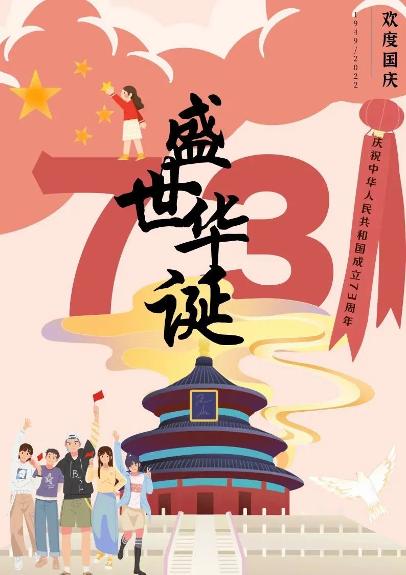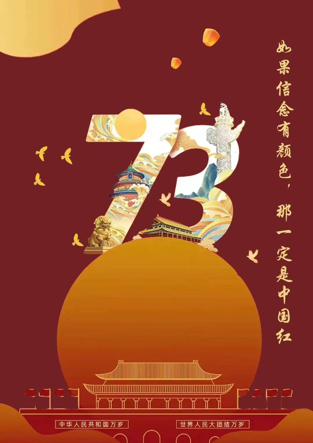 十月的色彩很鲜艳,十月的阳光很灿烂,十月的生日很隆重。一转眼,我们的祖国母亲73岁生辰到来了,为了庆祝祖国母亲的生日,我们设计了一款海报。整个海报的颜色基调以红色为主,一轮红日在天安门身后,使天安门显得庄严又美丽。红日上的73数字代表着祖国母亲的73岁生日,里面映入了纪念碑,石狮子,岳阳楼以及奔腾的河水,雄伟的高山,展现了祖国悠久的历史文化以及大好山河。以此作品为祖国母亲庆生,祝我亲爱的祖国生日快乐!