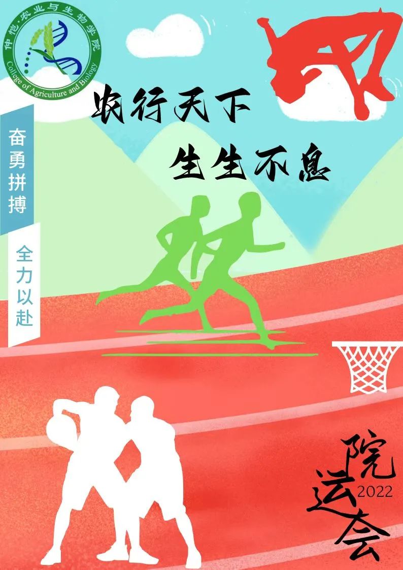 金秋十月,农生院院运会即将举行,海报以青山白云为上背景,彰显农生院保护环境,注重农业的精神,左上角的院徽和“农行天下,生生不息的院训代表了此次伟德bv1946官网院运会,跑道作为背景,三个相错排列的运动剪影为此次院运会的主体,彰显了运动会希望同学们可以积极参与,奋勇拼搏为班级争光,实现自我价值。