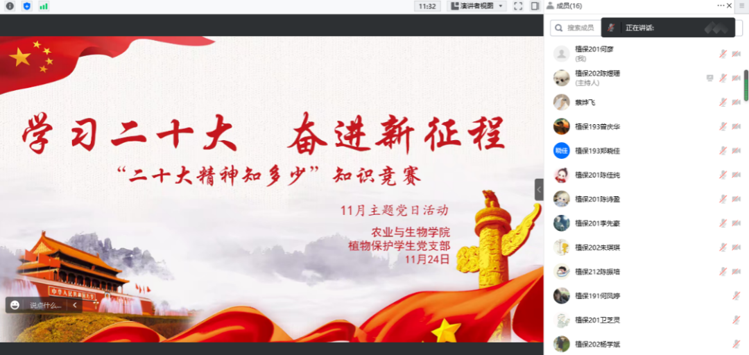 为学习宣传贯彻党的二十大精神,引导党员深入学习党的二十大报告,兴起学习热潮,11月24日晚,伟德bv1946官网植物保护员工党支部举行了“学习二十大,奋进新征程”为主题的线上知识竞赛活动,伟德bv1946官网植物保护员工党支部书记高结怡以及全体党员参与了此次活动。