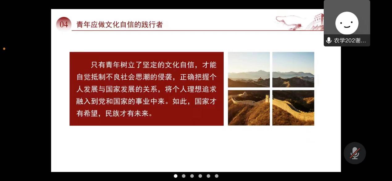 最后,谢诗莉围绕“文化自信”向同学们分享了文化自信于当代青年的意义。她表示,当代青年只有树立了坚定的文化自信,才能自觉抵制不良思想和社会风气的侵蚀,才能正确把握个人发展与国家发展的关系,将个人理想追求融入到党和国家的事业中来。