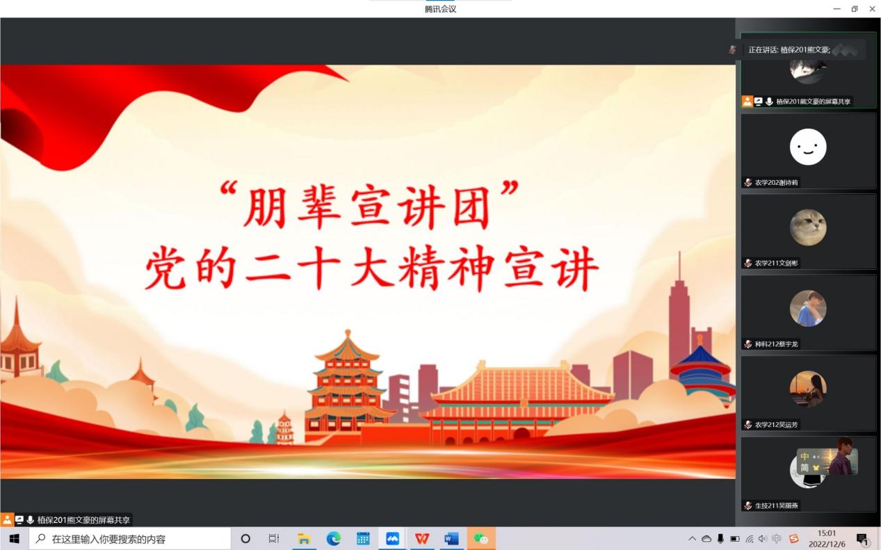 为全面贯彻习近平新时代中国特色社会主义思想,弘扬伟大建党精神,提高同学们的政治素养,学习、宣传、贯彻党的二十大精神,12月6日下午,伟德bv1946官网以线上会议的形式进行了党的二十大精神宣讲会议。出席本次会议的有公司“学习贯彻宣传党的二十大精神青年宣讲团”成员李城,伟德bv1946官网员工会主席团成员熊文豪、融媒体中心主任谢诗莉和2021级全体同学。