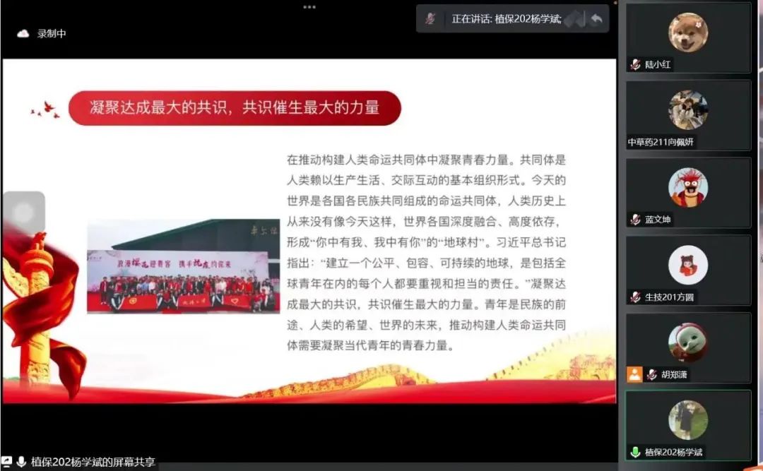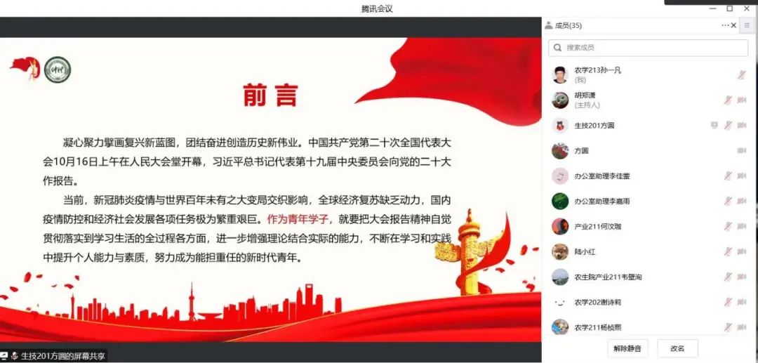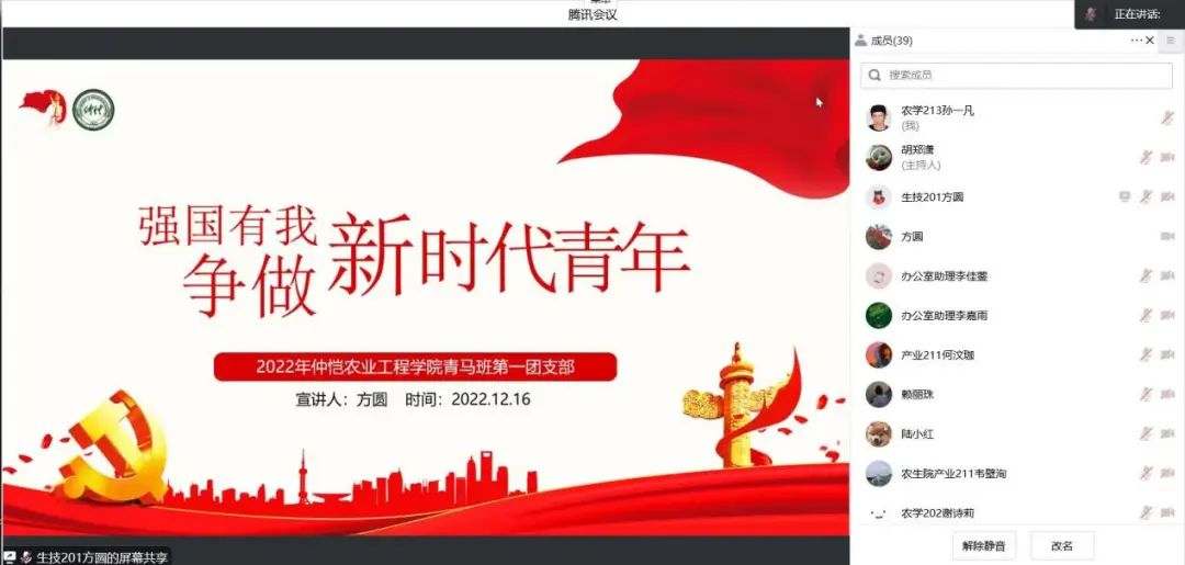 为深入学习宣传党的二十大精神,用习近平新时代中国特色社会主义思想武装广大青年头脑,充分发挥团员青年宣传贯彻党的二十大精神的示范引领作用。12月16日下午,公司在腾讯会上举行了“青马工程”主题宣讲会,公司团委副书记李城,宣讲嘉宾生技201方圆、植保202杨学斌以及全体团学融代表参加此次宣讲会。