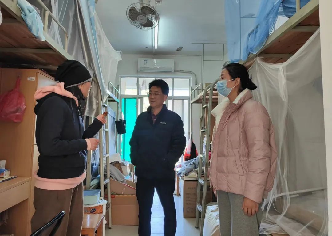 12月31日,周超雄书记、张金凤副书记一起走访员工宿舍,了解留校员工在校期间的学习生活以及离校时间,细致检查员工宿舍内务卫生和消防安全情况,叮嘱留校同学注意安全,保持良好的生活作息习惯,特别提醒同学们离校后“人走断电、关好门窗”,并送上新年问候和祝福。