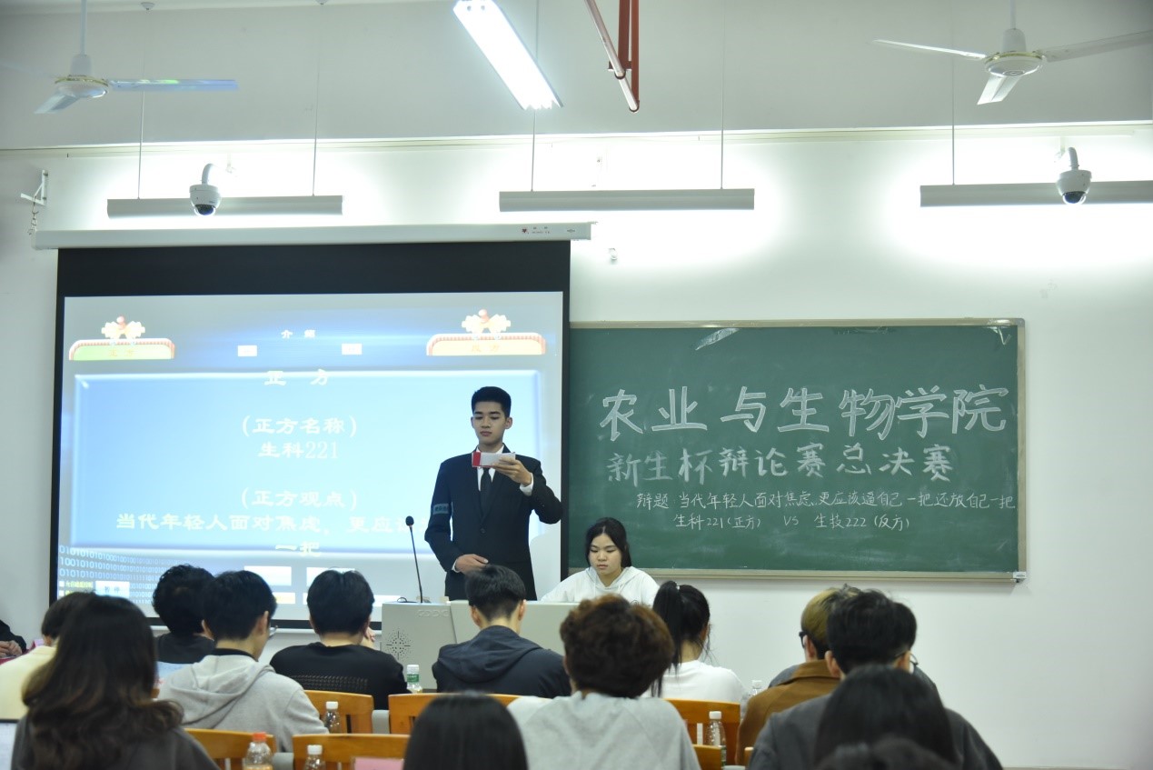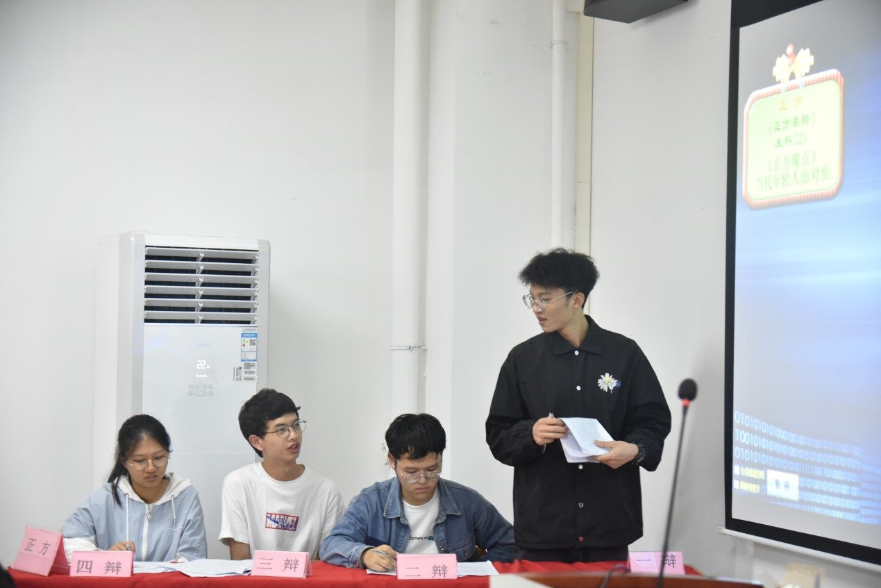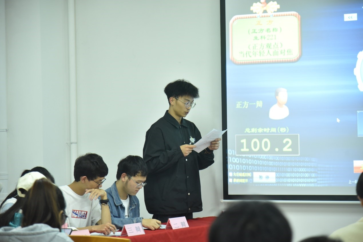 比赛开始前,现场先播放了往期赛程的视频,回顾了近一个月的辩论赛事。接着在双方辩手完成了自我介绍后,比赛正式开始。本次决赛生科221班为正方,生技222班为反方,他们围绕辩题“当代年轻人面对焦虑,更应该逼自己一把还是放自己一把”展开激烈辩论。