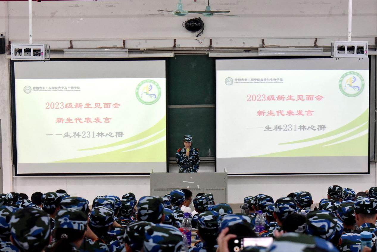 生科231班林心蘅同学作为新生代表发言。她向同学们分享了来到仲恺的喜悦之情、军训感悟以及对老员工活的憧憬,在演讲中洋溢出青春澎湃的激情与自信,展示了23级新生的蓬勃朝气与活力生机,立下了“在实现中华民族伟大复兴的不懈努力中书写青春华彩,在为人民利益的不懈奋斗中奏响生命华章”的远大志向。
