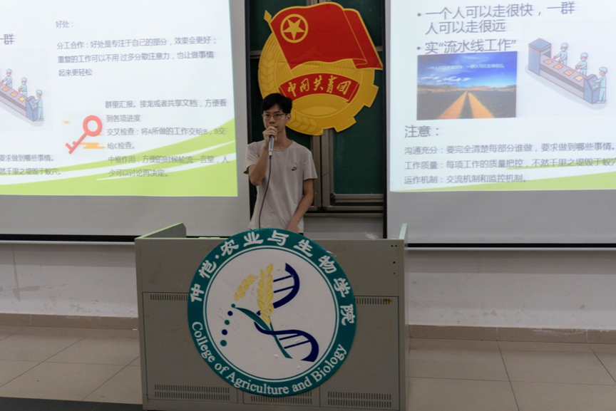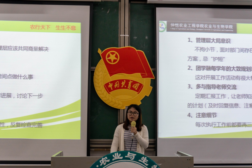 林梓韫首先进行发言,她本次演讲的主题是“追光而遇,沐光前行”,她希望同学们在参与员工工作时能够遇到光,成为光,散发光。林梓韫为大家分享了她从在仲园学习期间的团学融员工干部的工作经历以及个人在校学习生活中总结出的员工工作以及老员工活经验。最后她表示,大家应保持初衷,积极思考作为入党积极分子和“青马班”学员应该怎么做,做好自己的人生规划。
