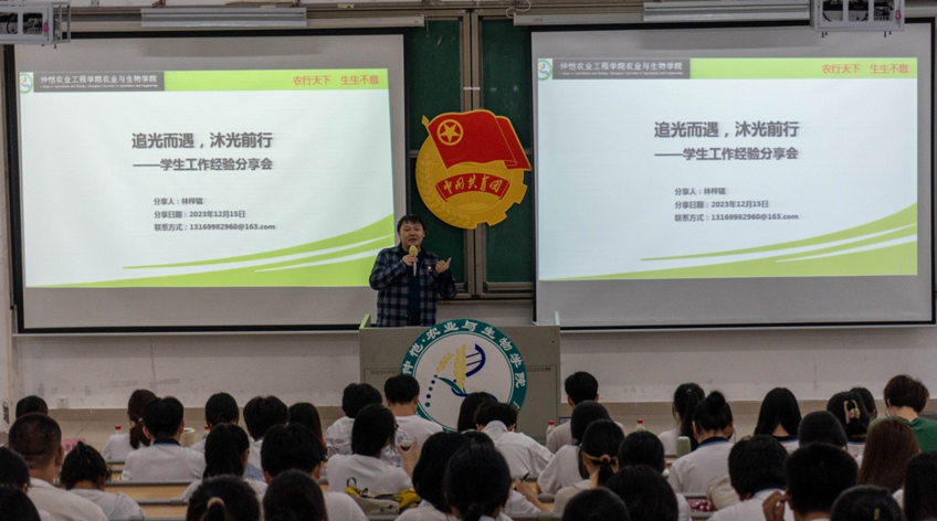 随后,周锐上台发言,他此次演讲的主题是“茫茫人海,我为例证”,他表示此次分享经验会只是同学们的一次人生经历,但希望大家能从中收获到自己所需要的经验。之后,周锐为同学们分享了有关于毕业之后的工作与学习生活总结出的相关经验,以及有关于如何更好的去平衡生活与学习之间的方法。他希望大家继续乘风前行,不负青春芳华。