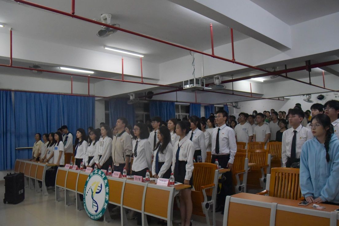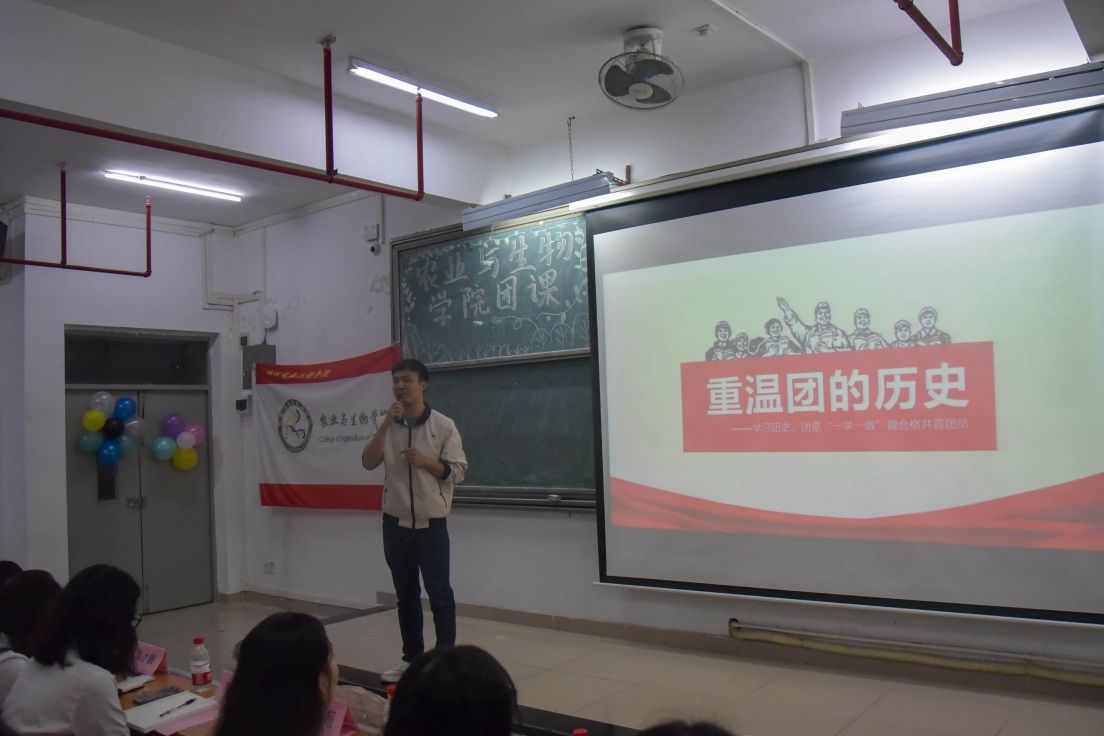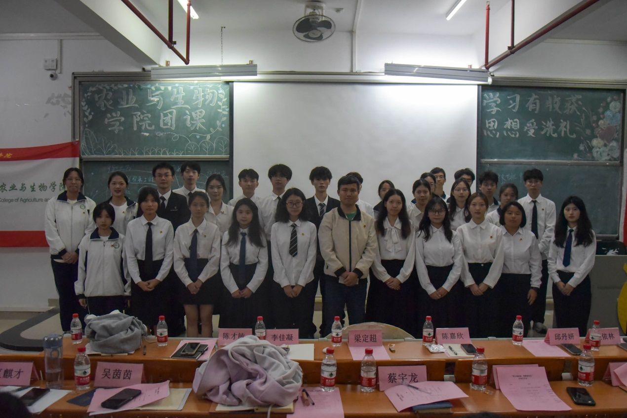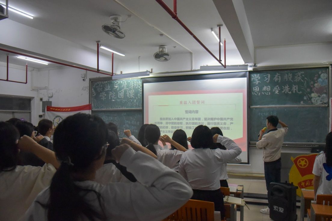 团课开始前,全体师生起立奏唱团歌,同学们声音洪亮,感情饱满,体现出了农生青年的风采。
