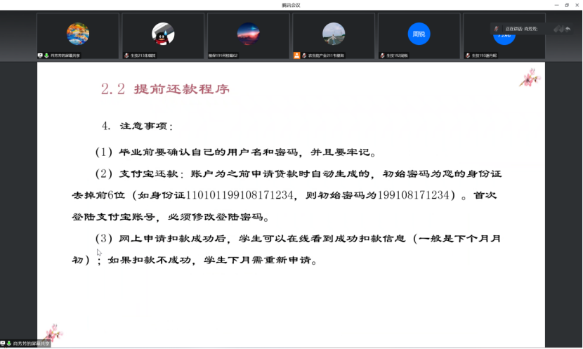 会议伊始,肖芳芳首先向毕业生讲解毕业确认操作,介绍了提前还款流程,她提示毕业生登陆主页后要及时修改信息和进行支付宝的实名认证,并鼓励贷款毕业生提前还款。接着她详细讲解了偿还利息操作流程,特别强调了利息计算、利息支付时间、展期办理等重要事项。