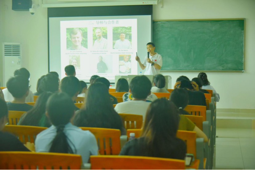 随后,曾永三教授向同学们分享了自己的访学与合作研究经历以及与导师和合作者之间良好合作、互相学习的情景。他简单介绍了他前不久求学所在的美国克莱姆森大学,并分享了在求学期间的点点滴滴。他特别提到了美国克莱姆森大学悠久的历史以及浓厚的学术氛围,老员工对待学术研究的态度、认真程度和动手能力等给他留下了深刻的印象。在访学期间,他主要从事的是农业领域相关研究,并分享了自己的主要研修工作和成果。
