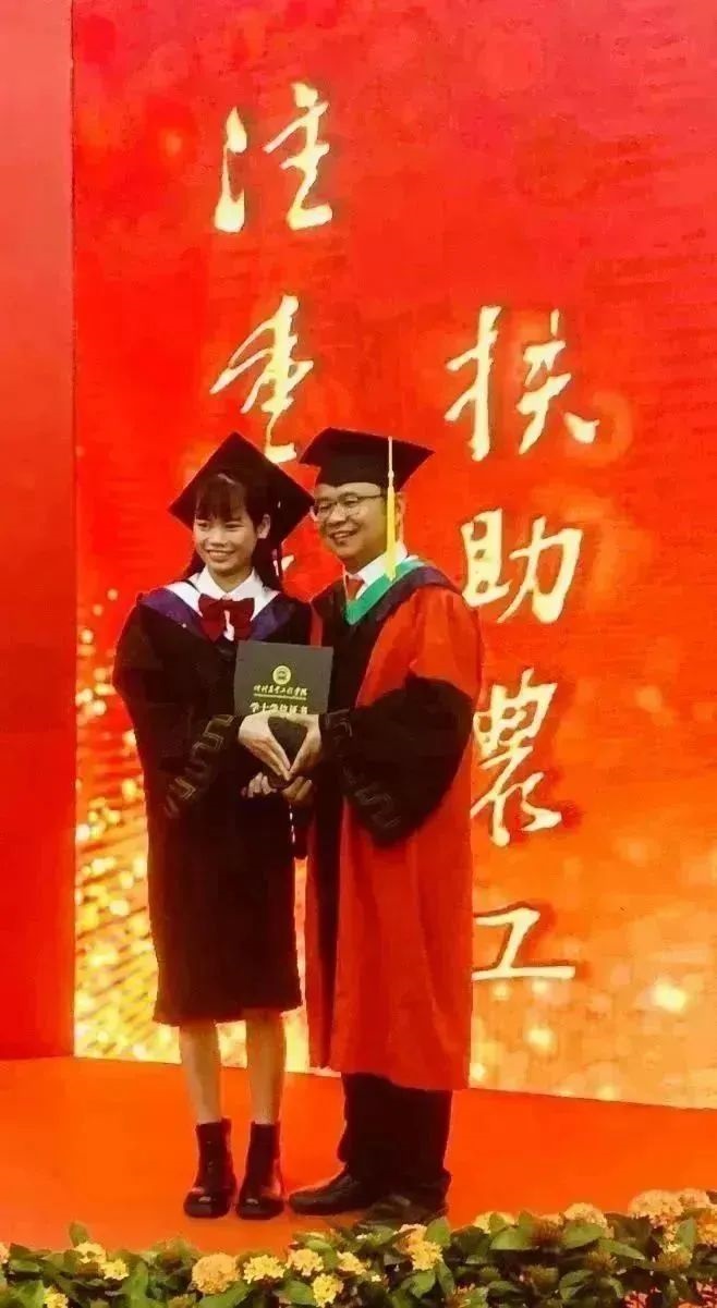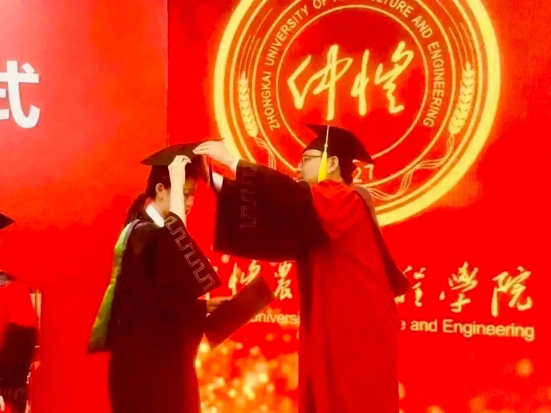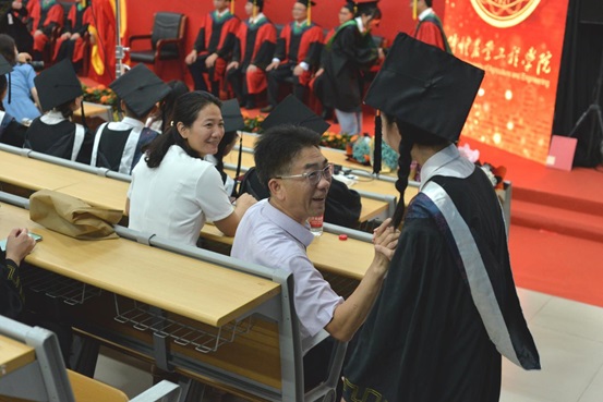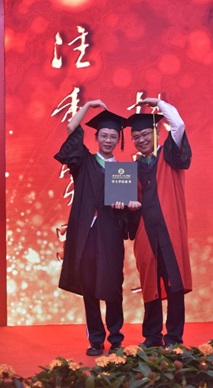 拨穗正冠是老员工毕业被授予学位的一项重要礼节,象征毕业生已学有所成,可以展翅高飞。廖明亲自为每位毕业生拨穗、颁发学位证书,与毕业生合影留念。