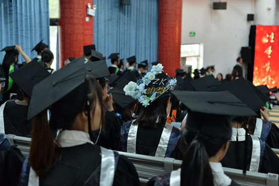 学位授予仪式在雄壮激昂的国歌声中拉开帷幕。参加仪式的毕业生们身穿庄重的黑色学士服,头戴着骄傲的学士帽,依次走上充满布满鲜花的礼台。