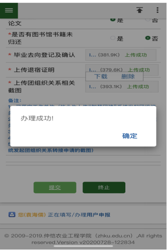 第五步:填写完毕后,显示“办理成功”,等待各环节审核。毕业生可在“待办”-“进行中”查看办理进度。