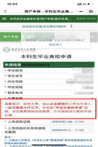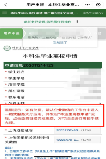 1.若学杂费有欠费情况,毕业生可在“本科生毕业离校申请”“研究生毕业离校申请”流程,点击缴费链接完成缴费,方可继续进行离校手续办理;若图书未归还或欠费的用户,无法发起此流程,需先完成图书归还或缴费再办理离校申请。