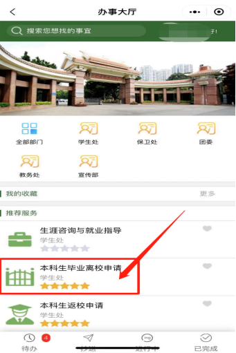 第三步:点击“员工处”标签,或直接在“搜索您想找的事宜”搜索框,搜索“本科生毕业离校申请”;