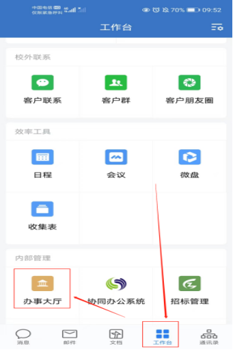 第二步:进入“工作台”,点击进入“办事大厅”;