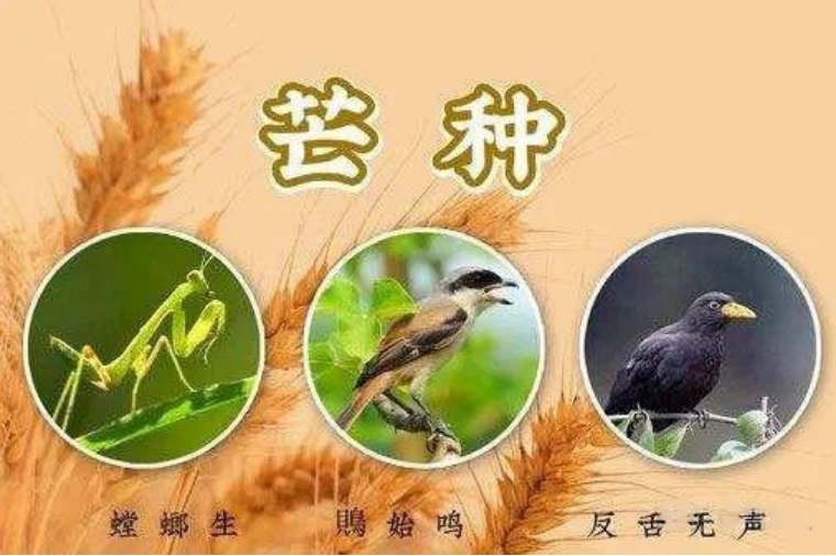 芒种节气十五天分为三候:一候螳螂生,二候鵙始鸣,三候反舌无声。意思是在芒种节气时,螳螂卵因气温变化而破壳生出小螳螂;喜阴的伯劳鸟开始在枝头出现,并且感阴而鸣;反舌鸟却因感应到了气候的变化,慢慢停止了鸣叫。