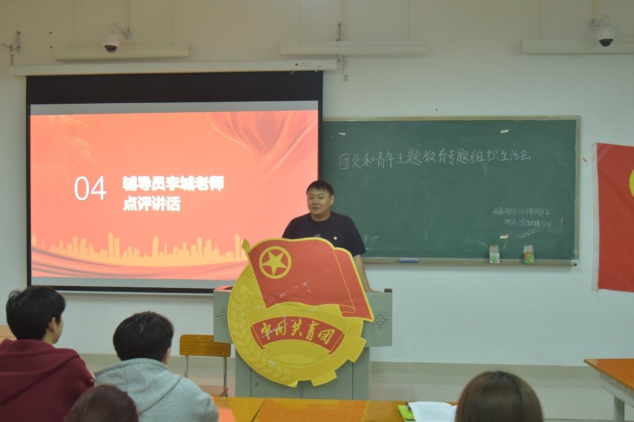 李城对本次专题组织生活会的开展情况进行点评,他给在场的同学提出了三个方面的要求:一,加强学习,提高政治站位,坚持用习近平新时代中国特色社会主义思想和党的二十大精神武装头脑、指导实践、推动工作。二,他以中国共产党的会议流程为例,指出团组织会议流程应做到规范化,并肯定了这次的专题组织生活会;三,他以当今世界的局势为引子提醒各位团员要重新认识自己的政治身份,学习党的创新理论,了解所学专业的相关政策,校准人生航向。