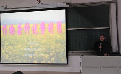 傅廷栋院士作了“作物杂种优势利用”的学术报告。傅院士首先介绍了绿色革命的发展和作物品质改良的目标和途径,并提出了关于作物杂种优势利用的几个问题以及傅院士研究团队研究饲料油菜杂交种的经历和该作物的特点、应用。并利用图片向在座的每位师生展示种植饲料油菜杂交种与普通油菜的对比效果,充分体现了饲料油菜杂交种的优越性。傅院士指出,他们团队今后的工作将会筛选出鲜草产量高,蛋白质含量25-25%(比毛苕子高)的油菜品系并且继续选育更耐盐碱的油菜品种以及合成抗病毒的饲料油菜。