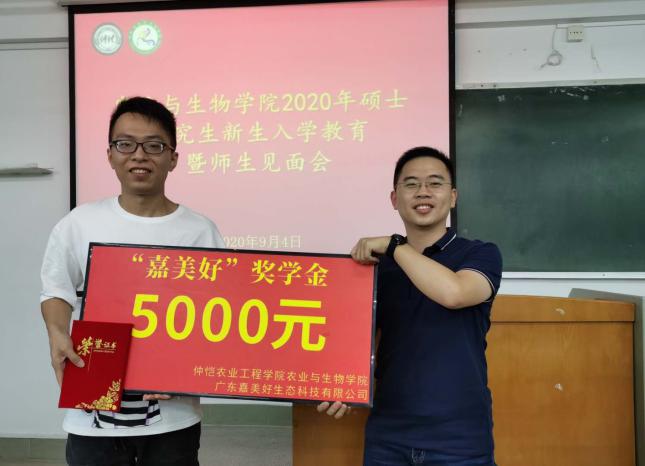 会上对公司2020级优秀研究生新生给予表彰和颁发奖学金。在嘉美好奖学金颁奖仪式上,公司副经理周玲艳宣读表彰决定,由公司党总支书记陈丹雄和广东嘉美好生态科技有限公司副总经理方佳煜颁发荣誉证书和奖学金5000元。