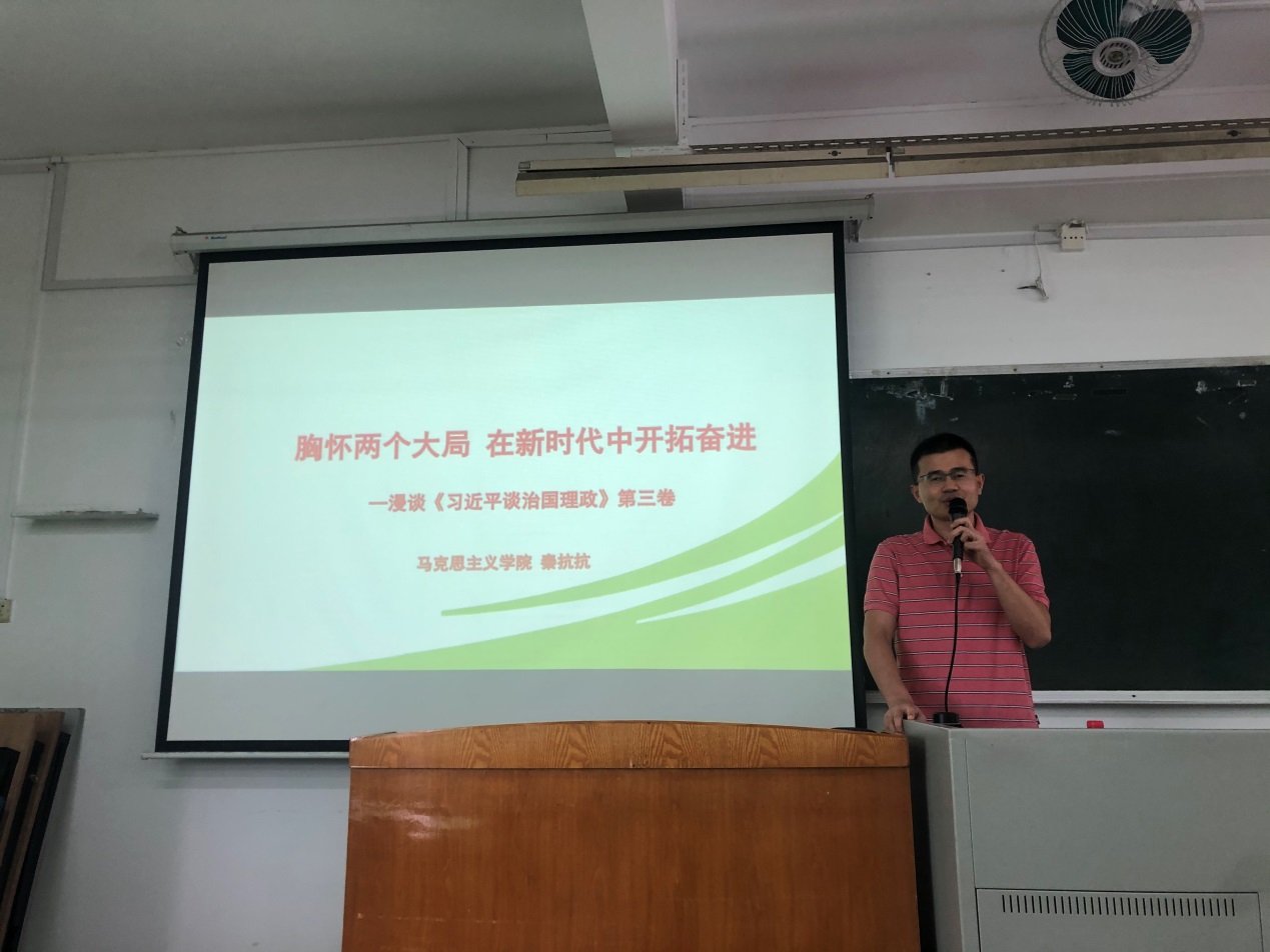 为深入贯彻学习《习近平谈治国理政》第三卷,深刻认识和把握习近平新时代中国特色社会主义思想,领会科学思想和工作方法,924日下午,伟德bv1946官网在海珠校区教学楼608集中学习《习近平谈治国理政》第三卷,会上邀请了马克思主义公司秦抗抗副经理为公司全体教职工做学习心得分享。公司领导班子成员带领全体教职工参加本次会议,会议由党总支书记陈丹雄主持。