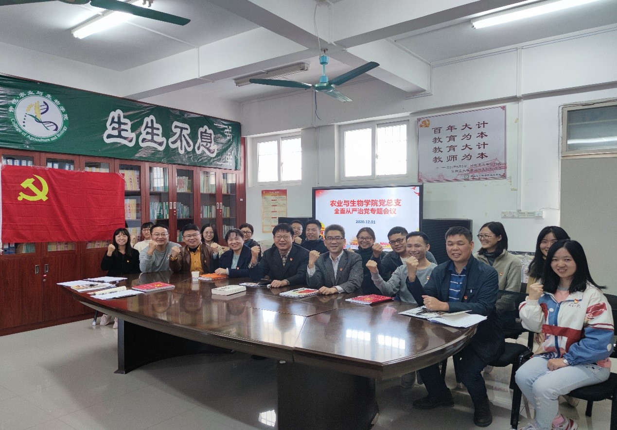 为深入学习贯彻党的十九届五中全会精神,贯彻落实全面从严治党,建设标杆先进党组织,12月1日上午,农业与生物公司党总支在白云校区刘宇新楼425会议室召开全面从严治党专题会议。公司党总支书记陈丹雄、党总支副书记周超雄、副经理周玲艳、工会委员、教工支部委员及员工支部委员参加会议。本次会议由党总支书记陈丹雄主持。