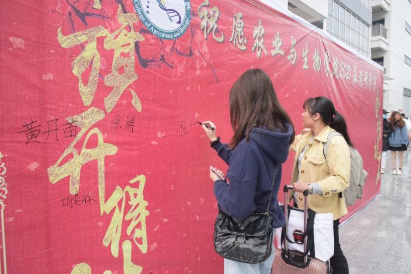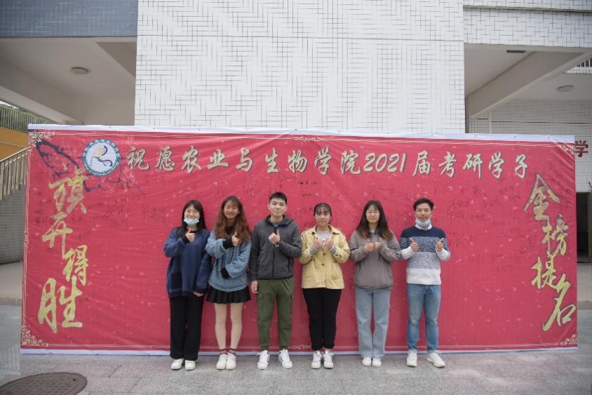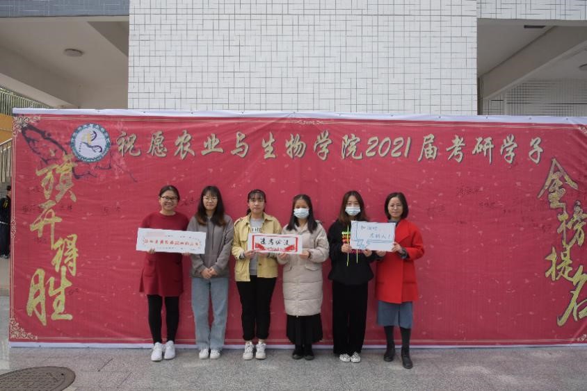 出发前,团学工作人员引导考研学子在“金榜题名”签名榜上签名,同时,公司辅导员高结怡、孙晓芳、苏登上前与考研学子们合影留恋,并向他们送上真诚的祝福。