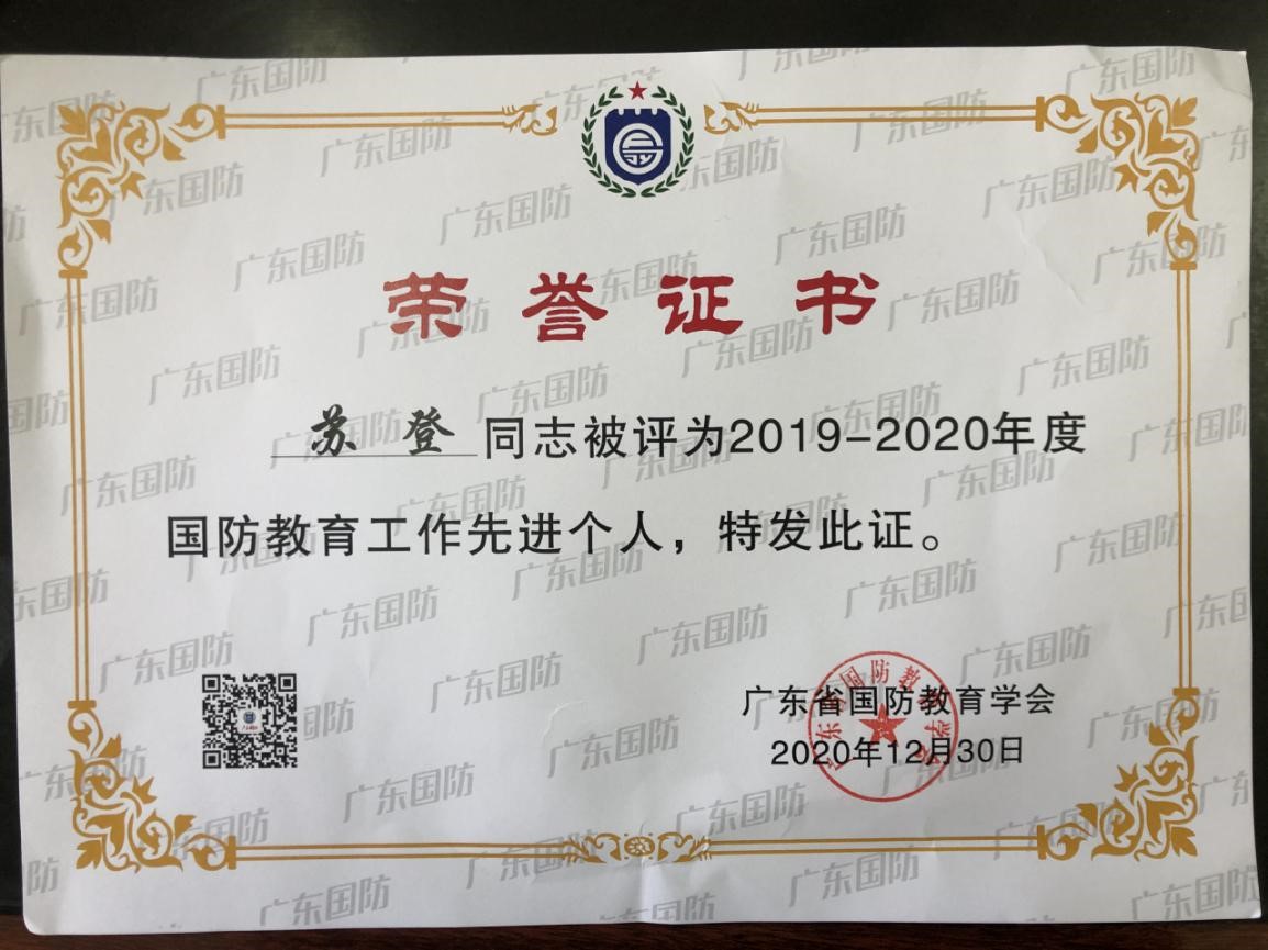 2020年广东省国防教育工作会议于12月29日至31日在潮州召开。会议对2020年全省国防教育工作成绩突出的集体和个人予以表彰并进行颁奖。经各单位、各高校推荐,经广东省国防教育学会评定,公司苏登老师获得“广东省国防教育工作先进个人”荣誉称号。