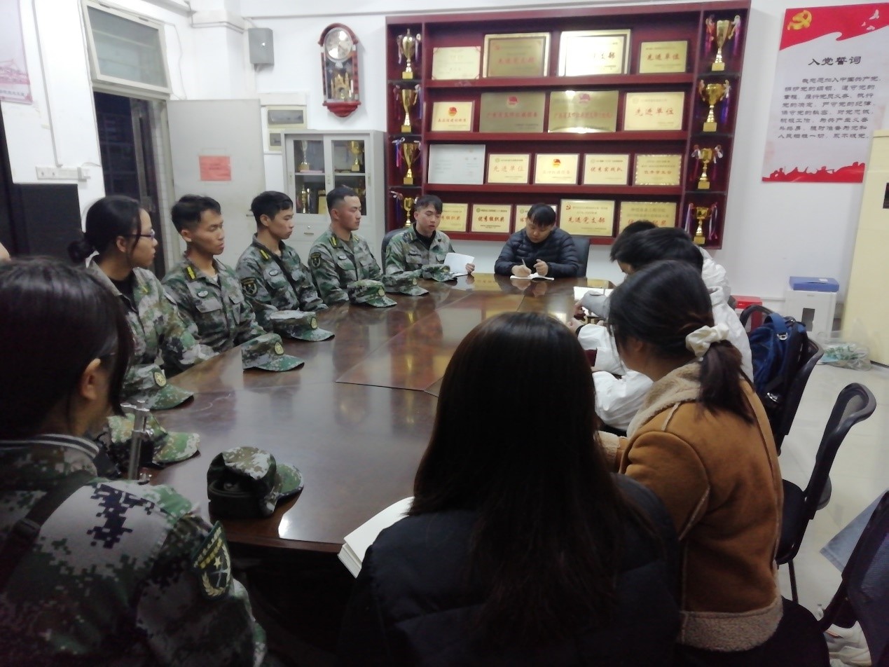 随后,教官和助班进行交流。员工教官营长黄浩提出,助班在值班期间要注意做好后勤工作,管理好公司物资,落实请假事宜以及医疗保障,军训期间做好防寒保暖的工作。通过这次的交流,教官和助班团都更清晰地了解了军训工作的内容。