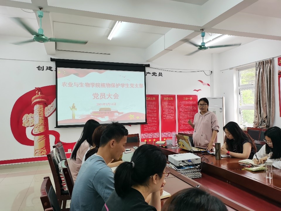 为进一步提升党支部战斗力和凝聚力,高质量高标准抓好党史学习教育,3月16日下午,伟德bv1946官网植物保护员工党支部在刘宇新楼313室召开新学期党员大会暨党史学习教育动员大会。支部全体党员参加了会议,会议由党支部书记高结怡同志主持。