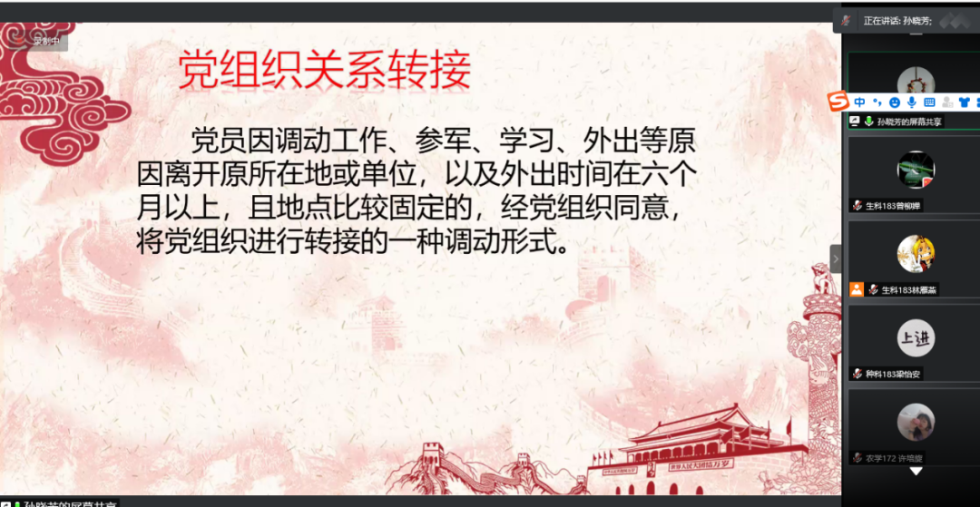 大会开始,孙晓芳老师为毕业生党员详细讲解了党组织关系转接的相关事宜。针对不同毕业去向的党员,分类梳理,从什么是党员组织关系、党组织关系如何转接、《党员组织关系介绍信》、介绍信回执的处理、党员档案等几方面为毕业生党员进行了详细的解说。