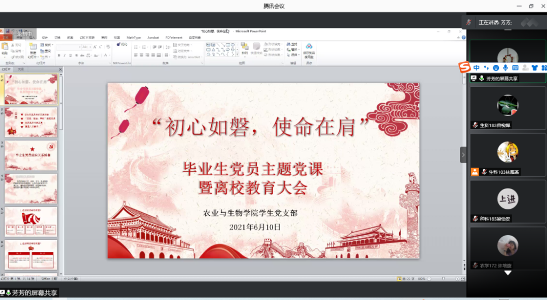 2021年6月10日,伟德bv1946官网在线上开展了毕业生党员主题党课暨离校教育大会。本次活动由生命科学员工党支部书记孙晓芳主持,公司党委副书记周超雄出席并指导,2017级全体毕业生党员参与。