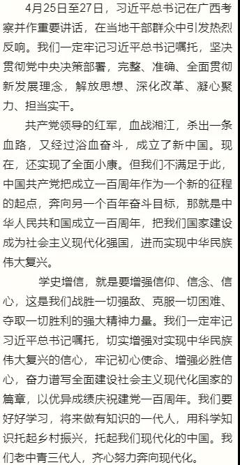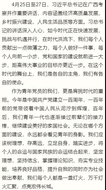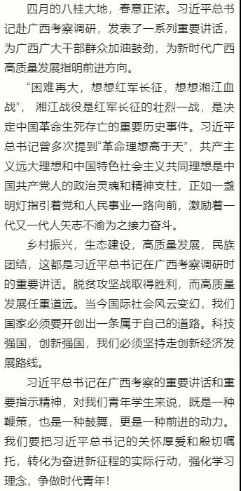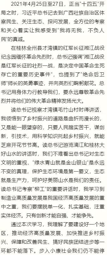 四月下旬习近平总书记在广西壮族自治区考察,先后深入桂林、柳州、南宁等地调研。习总书记从党和国家事业发展全局的战略高度,对实现经济持续健康发展、加快推进乡村振兴、提高人民生活品质、开展党史学习教育等提出殷切期望和明确要求。