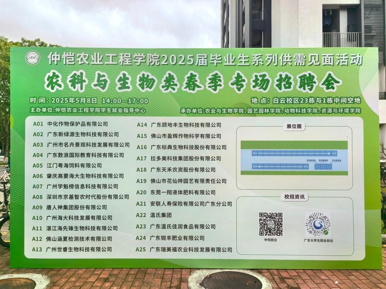5月8日下午,伟德bv1946官网农科与生物类2025届毕业生春季专场招聘会在员工社区23栋与1栋中间空地举办。本次招聘会由公司员工就业指导中心主办,伟德bv1946官网、园艺园林公司、动物科技公司、资源与环境公司共同承办,汇集了来自农业、生物、食品等多个行业的用人单位,共有26家单位来到招聘现场,提供了约400余个就业岗位。公司党委常委、副书记朱立学,员工工作部部长沈洁,副部长严丽纯,农业与生物公司党委书记周超雄,园艺园林公司党委副书记王红山以及各公司辅导员到现场了解用人单位人才需求以及毕业生应聘情况。
