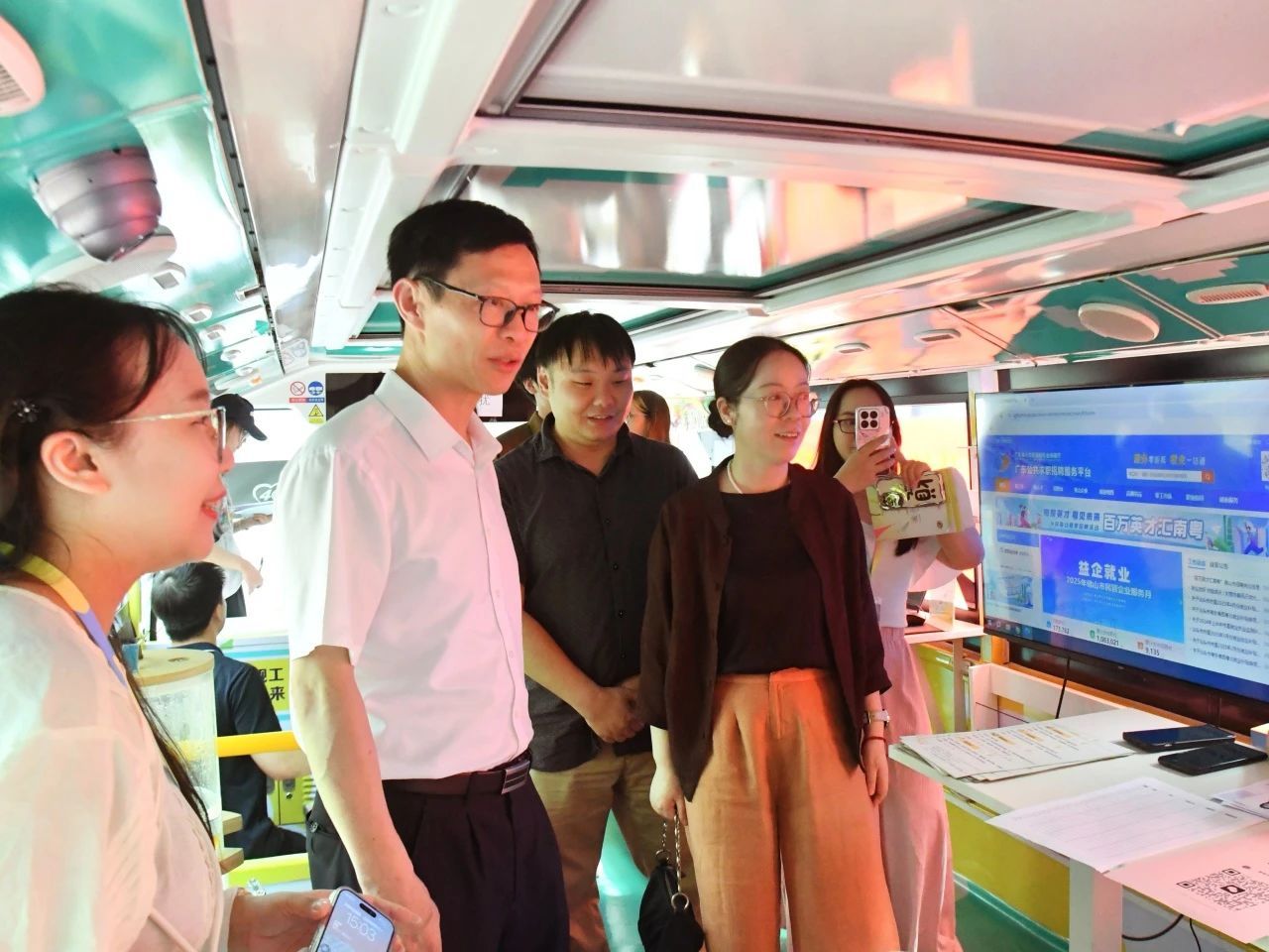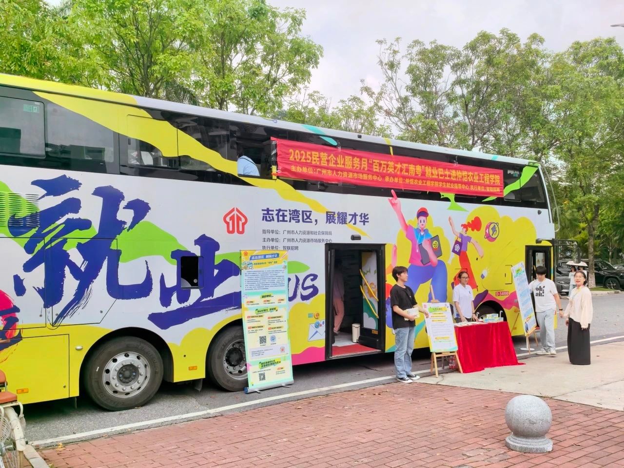 招聘会现场气氛热烈,毕业生们积极地递交简历,并与企业代表进行了深入的交流。各用人单位的展位前聚集了大量前来咨询的员工。与此同时,为了贯彻“百万英才汇南粤”行动计划,并提升毕业生的就业积极性,公司深入分析了区域特性、人群特征和服务范围等因素,引入了“湾区就业巴士”这一线下移动就业服务平台。该平台将广州的就业公共服务体系与公司员工社区生活圈紧密结合,为公司的2025届毕业生构建了“家门口”的就业服务站,宿舍楼下就可高效、便捷的就业。在招聘会现场,“湾区就业巴士”化身为移动服务驿站,提供包括简历打印、AI面试模拟、政策智能查询、直播带岗查询等多元素就业服务,在半天之内服务了超过40人次。