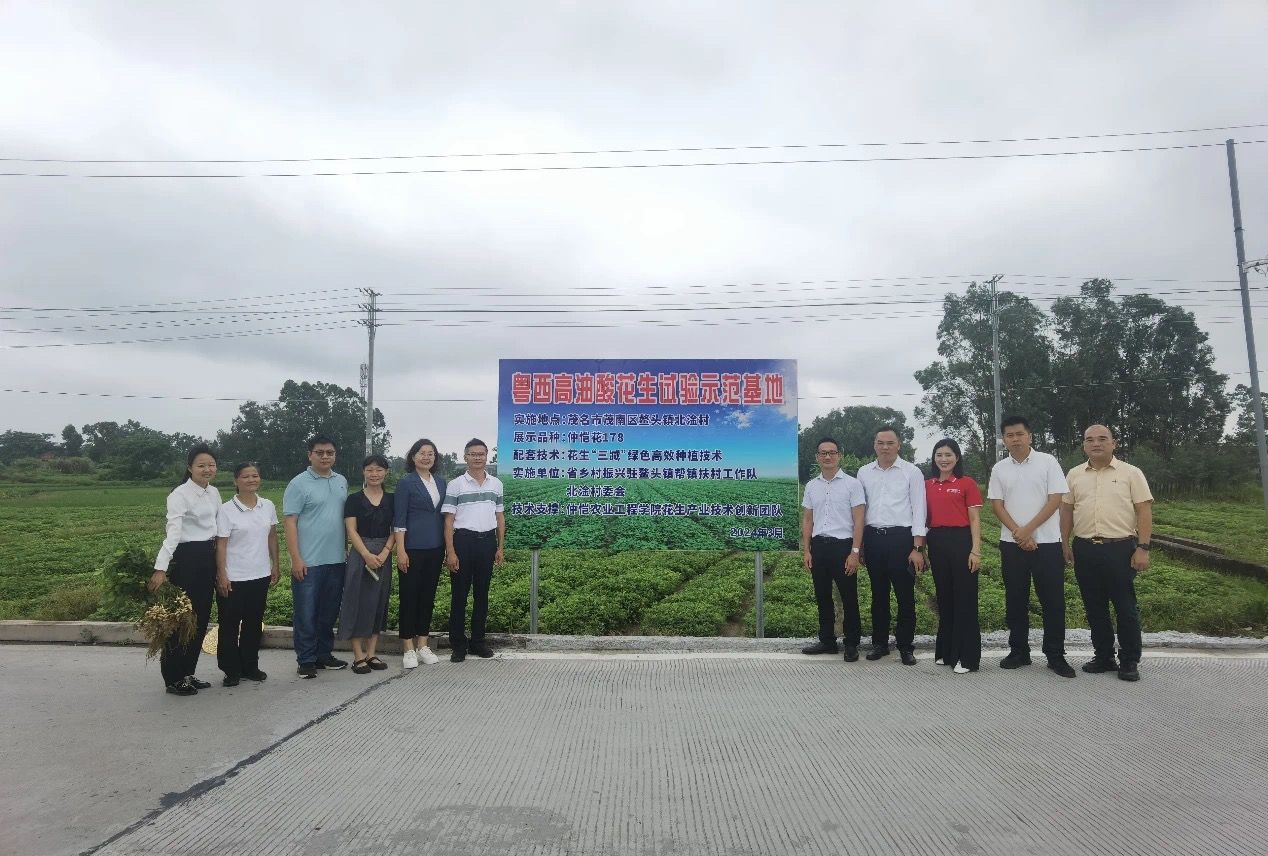为深入贯彻落实广东省百县千镇万村高质量发展工程,5月30日由伟德bv1946官网现代种业创新研究院与茂南区鳌头镇驻镇帮扶工作队、广东集跃食品有限公司合作共建的“茂南区科产教示范基地”在茂南区鳌头镇北淦村正式揭牌。公司现代种业创新研究院郑奕雄教授、刘季平副教授,茂南区农业农村局常务副局长江桂清,省乡村振兴驻鳌头镇帮扶村工作队长、鳌头镇党委副书记(挂职)石欣景,鳌头镇副镇长张旭东,广州国家现代农业产业科技创新中心粤西研究院经理凌小梅,公司联合培养研究生单位——广东石油化工公司黄新敏博士,鳌头镇北淦村委书记吴汉文,以及茂南花生产业园实施主体等各方代表共20余人出席了揭牌活动。