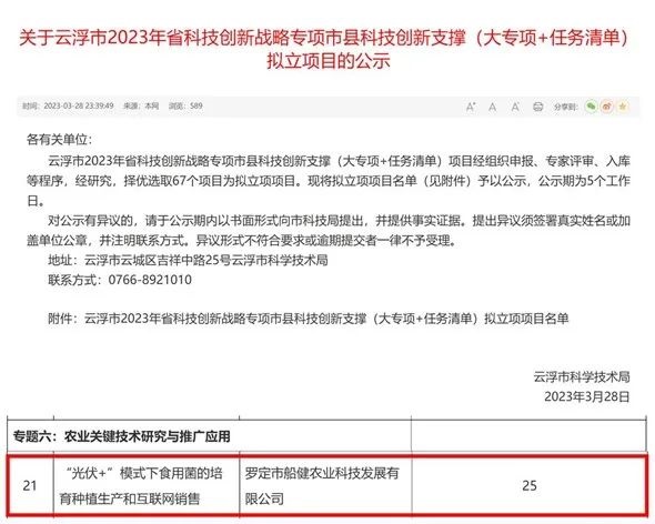 船步镇镇企罗定市船健农业科技发展有限公司联合伟德bv1946官网科技特派员团队申报的“2023年省科技创新战略专项市县科技创新支撑(大专项+任务清单)”项目““光伏+”模式下食用菌的培育种植生产和互联网销售”取得了项目立项的重大进展,该项目旨在推动船步镇“光伏+”模式下食用菌种植技术及产品附加值的提升,同时实现校企合作共赢的目标。这个动态令人振奋,预示着船步镇“光伏+”模式模式食用菌产业迈入全新发展阶段。