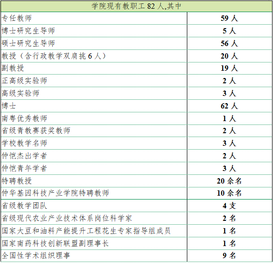科教创新硕果累累 近五年来,公司承担国家自然科学基金项目、国家重点研发计划子项目、广东省重点研发计划等国家、省部级科技项目200余项,科研经费9000余万元;育成通过国家、省级审定(登记)的农作物新品种20余个、获得国家授权专利和软件著作权50余件,发表SCI、EI收录论文200余篇,其中在国际顶级学术期刊Nature Genetics发表论文2篇。研发并推广了绿色高效先进适用技术18套,农作物育种科技成果100%转化为生产力,其中花生新良种“仲恺花1号”于2017年被评为广东省最受欢迎的农业主导品种、2022年入选国家优良品种推广目录、2023年入选国家花生骨干型品种;“花生‘三减’绿色高效种植技术”、“光合高脂膜在花生减药增产上的应用”入选广东省农业主推技术。 · 国家级一流专业1个 · 省级一流专业2个 · 省级特色专业2个 · 省级教学教育成果一等奖2项、二等奖2项 · 校级教学教育成果奖10余项 · 省级科学技术奖一等奖2项、二等奖1项、三等奖9项 · 省级农业技术推广奖、市级科学技术奖等10余项